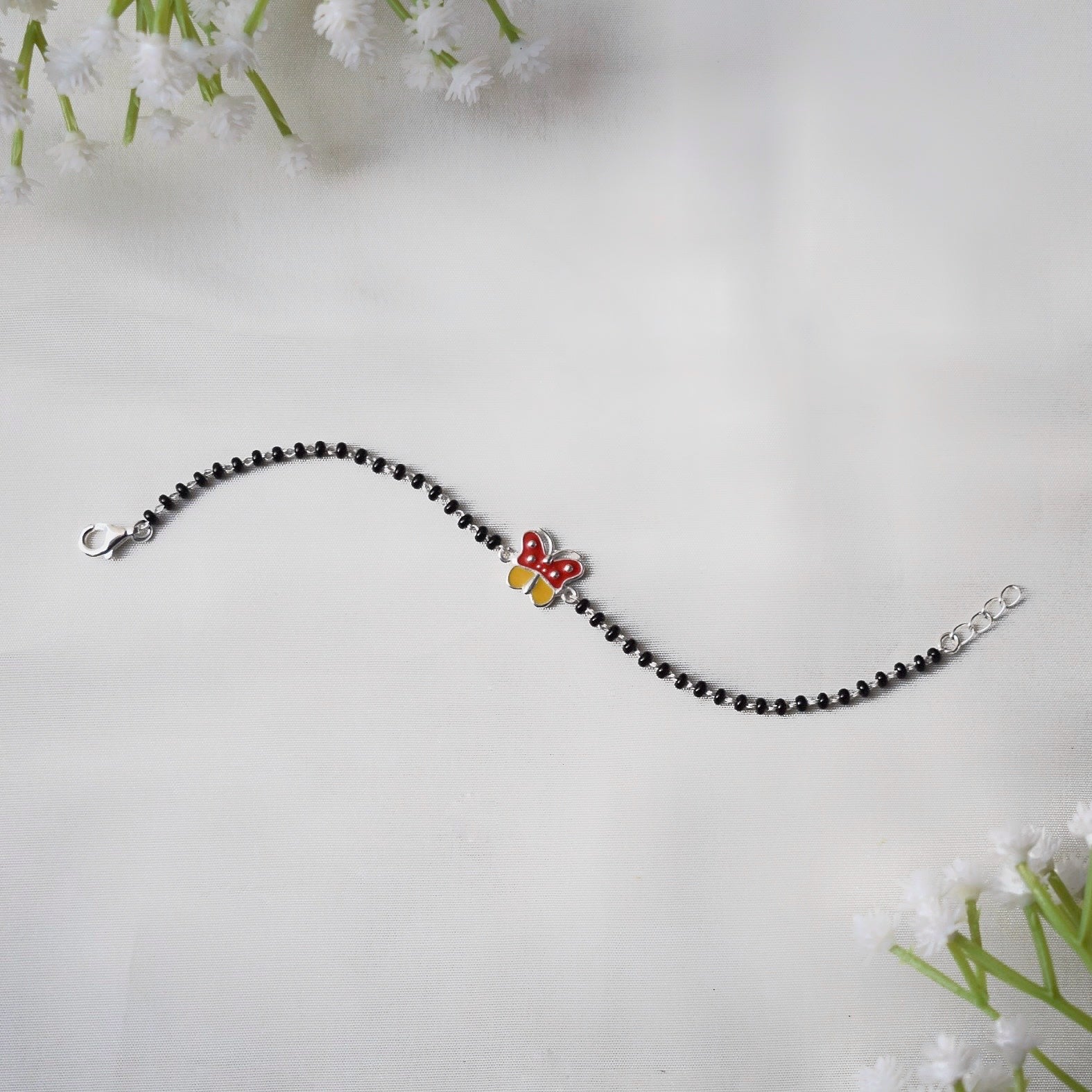 Design: Butterfly charm with protective black beads in soft silver chain