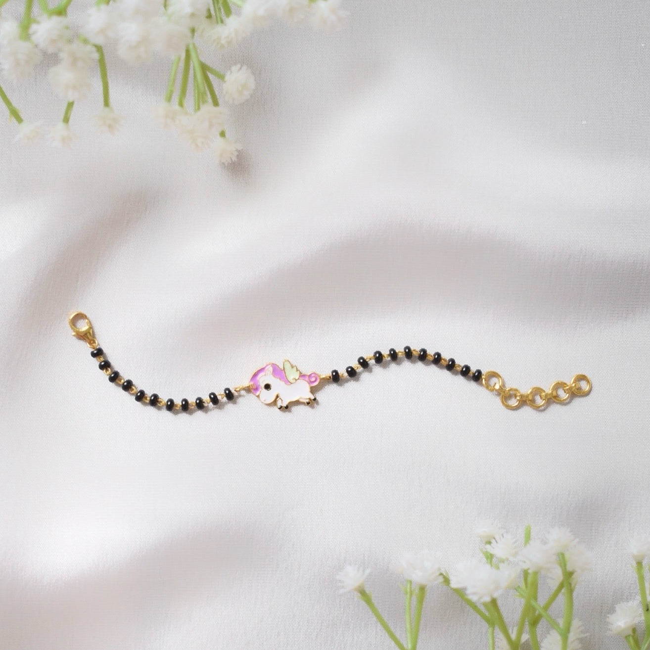 The MagicWings Nazariya captures the wonder of childhood with a touch of tradition. Featuring a charming flying unicorn crafted in pure 925 silver, paired with classic black beads, this nazariya symbolizes dreams, positivity, and protection. A magical keepsake designed to shine on every little wrist.