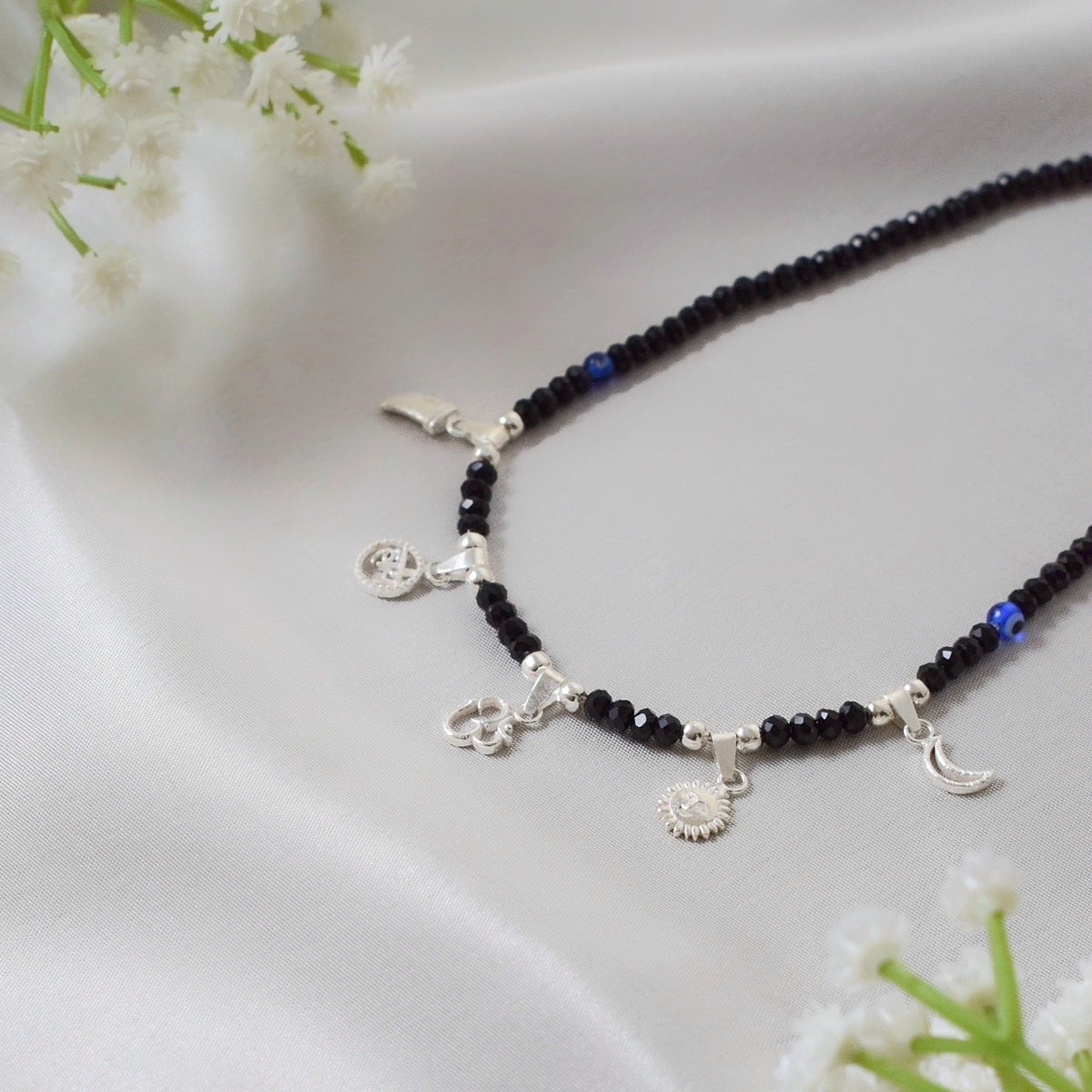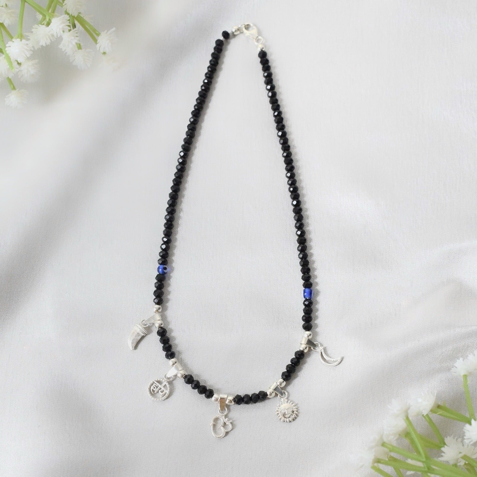 Design: Combination of Chand, Suraj, Om & Sword charms on a black beads chain