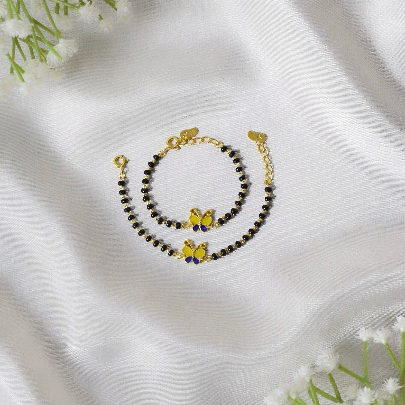 Let your little one flutter with happiness and protection with the Butterfly Charm Nazariya Bracelet. Handcrafted from pure 925 silver and available in a dazzling 18K gold-plated finish, this adorable bracelet features a charming butterfly motif paired with traditional black beads. The butterfly symbolizes transformation, joy, and positivity, making it a delightful and meaningful addition to your child's jewelry collection..