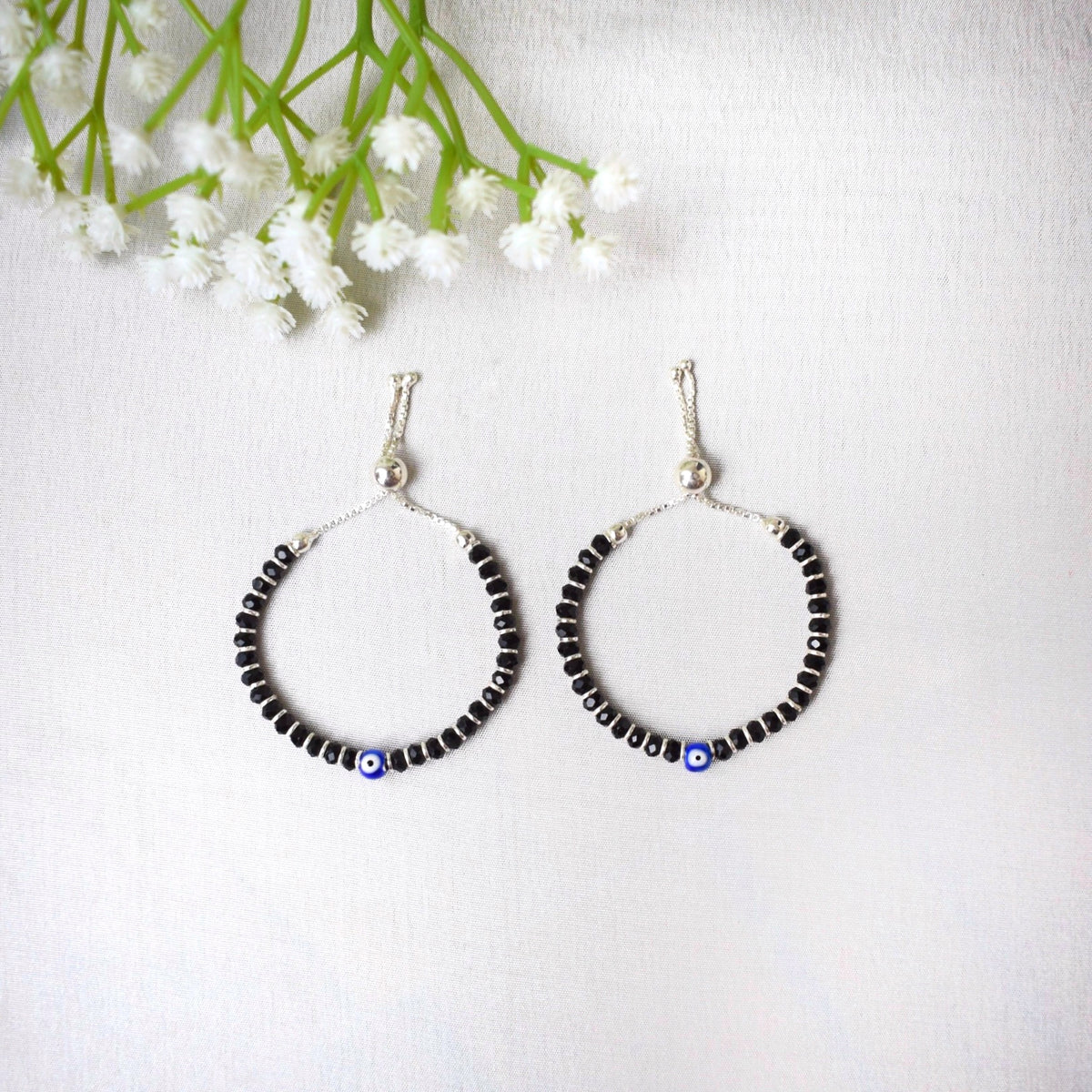 Protect your little one from negative energies with this grace and positivity-filled Evil Eye Nazariya Bracelet Set. Made from pure 925 silver, this set of two bracelets features beautifully crafted evil eye charms paired with traditional black beads, believed to ward off negativity and bring good fortune.