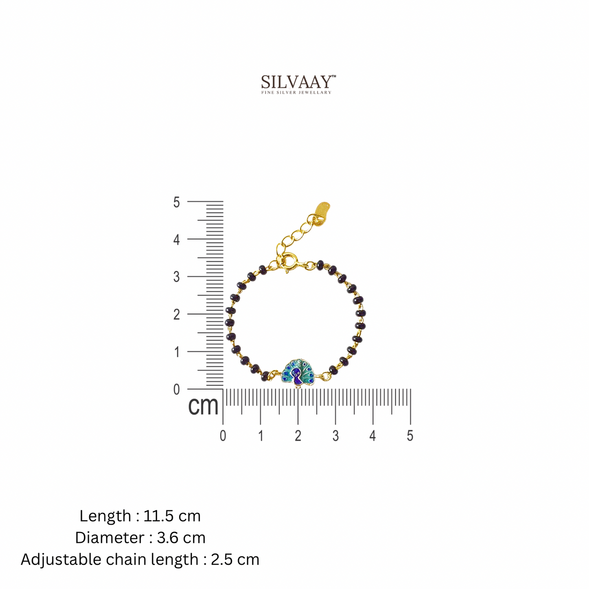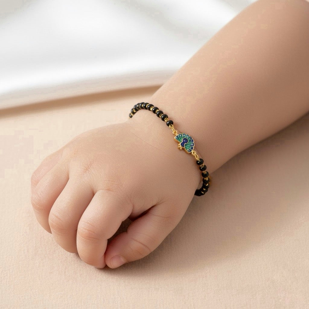 Add a touch of grace and charm to your child's wrist with our Dancing Peacock Charm Nazariya Bracelet. Crafted from pure 925 silver and also available in a luxurious 18K gold-plated finish, this beautiful bracelet features an elegant peacock charm paired with traditional black beads. Known for symbolizing beauty, joy, and protection, the dancing peacock brings vibrant energy and timeless tradition together in one delightful design.