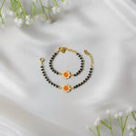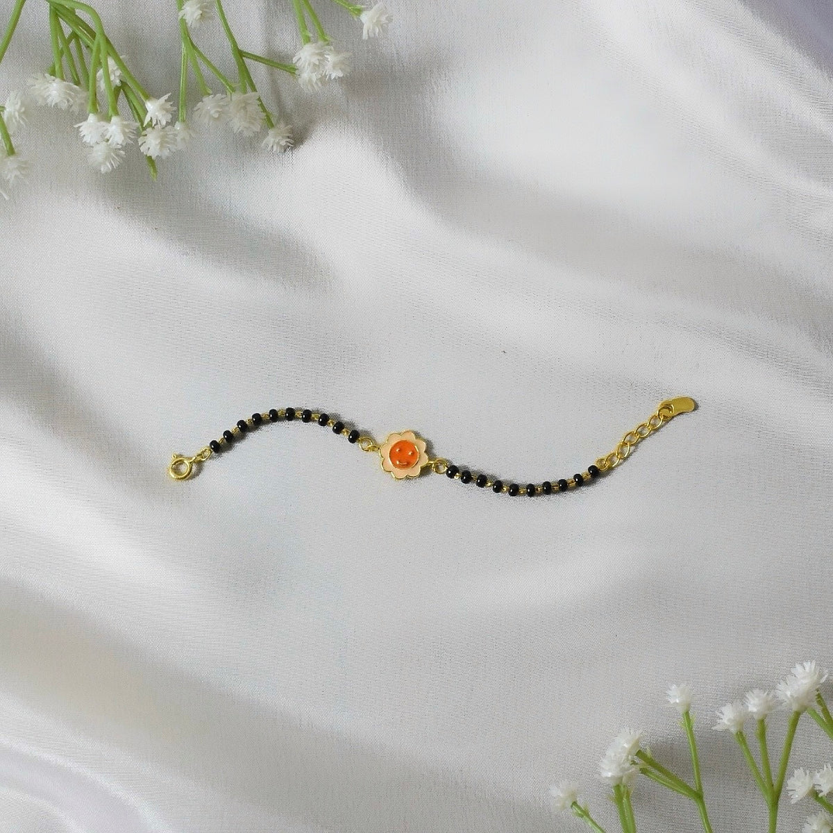 Design: Delicate elephant charm with traditional black beads for protection